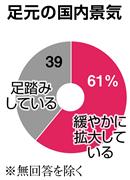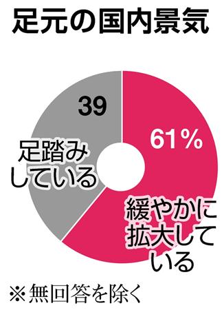 フジサンケイビジネスアイが23日まとめた主要118社を対象とするアンケートによると、足元の国内景気について、「緩やかに拡大している」と答えた割合は、全体の61%と過半に達した。ただ、力強さに欠けるとの認識も目立ち、「足踏みしている」との回答も39%に上った。とりわけ、国内総生産(GDP)の約6割を占めている個人消費への懸念が根強い。
