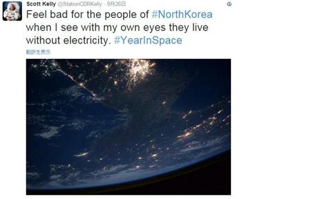 ケリー氏は約1年間の計画で搭乗中の米航空宇宙局(NASA)のベテラン宇宙飛行士。数日にわたり地球を撮影した写真を投稿。北朝鮮のツイートでケリー氏は、夜間に「電気なしの生活」を余儀なくされている人々の現状を嘆いた。