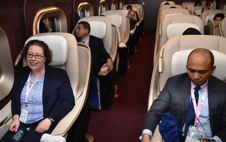 国交省が企画した見学ツアーで、北陸新幹線「はくたか」の最上級グレード「グランクラス」の乗り心地を体験する各国大使館員ら=27日【拡大】