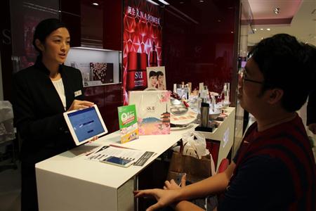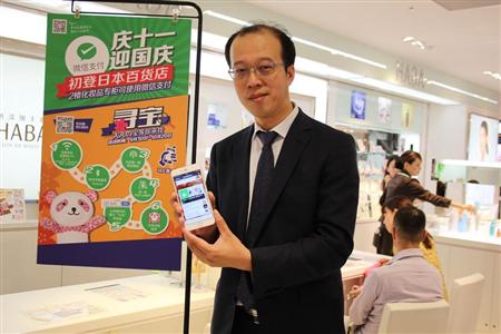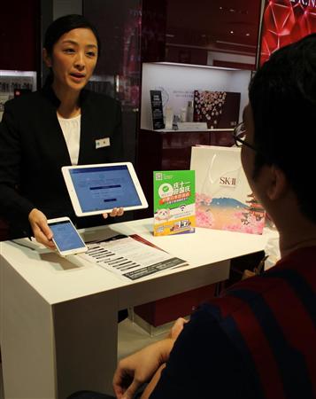 9月30日、大丸梅田店の化粧品カウンター。妹に頼まれた化粧品約6万円分を購入したシンガポール在住の台湾系男性(31)は店員から、この日導入されたばかりのスマホ決済システムの説明を受けると、早速興味を示した。