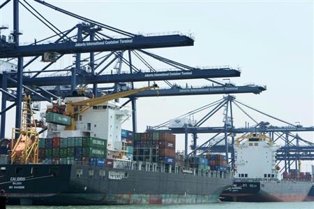 主要港タンジュンプリオク港で、コンテナの積み卸し作業中の貨物船。インドネシアはTPP参加に向け、競争力強化に注力する=ジャカルタ(AP)【拡大】