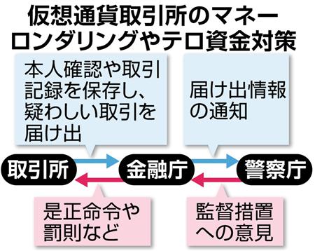 政府は16日、「ビットコイン」など仮想通貨の法規制について、現金と仮想通貨を交換する取引所に対し資金洗浄を取り締まる「犯罪収益移転防止法」を適用する検討に入った。金融庁が監督官庁となり、口座開設時に顧客の本人確認義務などを課して、資金洗浄やテロ組織の資金調達などに悪用されるのを防ぐ。早ければ年末に報告書をまとめ、来年の通常国会で法整備する方針だ。