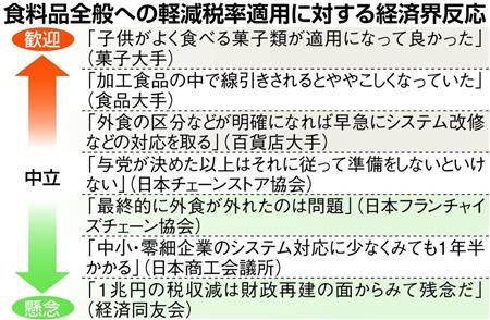政府・与党が2017年4月の消費税増税時に導入する軽減税率の対象を「食料品全般」と決めたことについて、経済界からは14日、賛否の声が上がった。軽減税率の適用を受ける食品業界は軒並み歓迎し、システム改修の特需が予想されるIT業界でも期待の声が聞かれた。一方、適用外となった外食を、食品とどう区別するかという懸念や制度導入に伴う財政面への影響を心配する声も目立った。