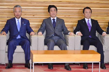 臨時閣議に臨む(左から)甘利明経済再生担当相、安倍晋三首相、麻生太郎財務相=24日午前、首相官邸(斎藤良雄撮影)【拡大】