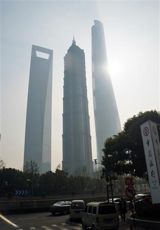 中国で最も高い地上128階建ての超高層ビルとして建設中の「上海中心大厦」(632メートル、右)。この日は正午段階でPM2.5を含む大気指数が323と、重度の大気汚染で超高層ビルもかすんでいた=25日、上海(河崎真澄撮影)【拡大】