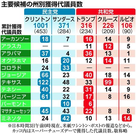 【ワシントン=青木伸行】民主党のヒラリー・クリントン前国務長官と、共和党の不動産王ドナルド・トランプ氏は、予備選・党員集会の天王山であるスーパーチューズデーで大半の州を押さえ、11月8日投票の大統領選はクリントン氏対トランプ氏の対決となる可能性が一段と高まった。