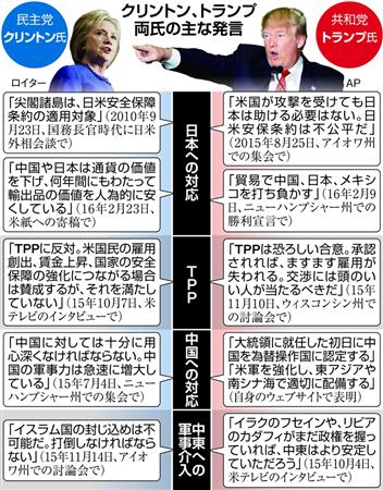 両氏の共通点は、高支持率の一方で「嫌われ度」もトランプ氏60%、クリントン氏55%と高いことだ。両氏が対決すれば、「嫌われ者」同士の戦いとなる。