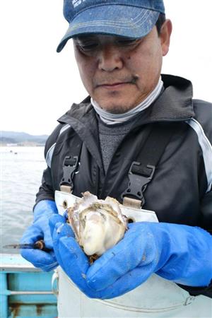 津波被害の痕跡が残る宮城県南三陸町志津川地区。この漁場で、国内でも珍しい1年物の未産卵カキの養殖が進んでいる。生産者の佐々木昇記さん(58)は「今年はかなり育ちがいい」と満足顔だ。