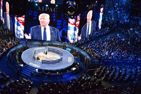 在米イスラエル・ロビー団体、米国イスラエル公共問題委員会(AIPAC)の年次総会で演説する米大統領選の共和党候補、不動産王トランプ氏=21日夕、ワシントン(加納宏幸撮影)【拡大】