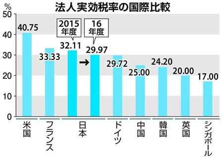 法人実効税率は20%台到達の目標を当初方針より1年前倒しした。さらに2018年度には29.74%まで下げる。外形標準課税の拡大などで財源を確保して産業界全体の税負担は変えず、稼ぐ企業の成長を後押し。政府はその見返りに投資や賃上げを求め、経済成長につなげることを想定した。