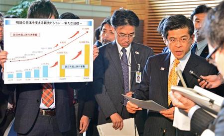 政府は30日、訪日外国人観光客の拡大に向けた具体策をまとめる「明日の日本を支える観光ビジョン構想会議」(議長・安倍晋三首相)を開き、訪日外国人観光客数の目標人数を倍増させ、平成32(2020)年に4千万人、42(2030)年に6千万人とすることを決めた。首相が掲げる名目国内総生産(GDP)600兆円の達成に向け、観光施策をその起爆剤にしたい考えだ。