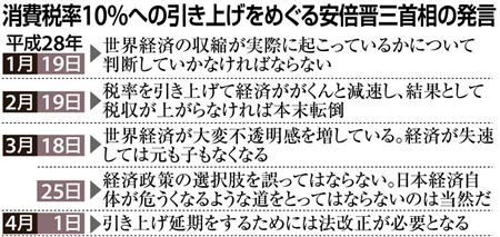 訪米中の安倍晋三首相が1日(日本時間2日)、同行記者団との懇談で、平成29年4月の消費税率10%への引き上げの再延期に関して「法改正」という具体的な手続きに言及したのは、増税先送りへの“環境整備”といえる。首相はすでに税率引き上げを先送りする方針を固めており、5月26、27両日に開催する主要国首脳会議(伊勢志摩サミット)前後に最終決定するものとみられる。