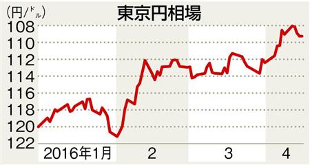 主要産油国がカタールで開いた会合で、増産凍結で合意できなかったことを嫌気し、前日のニューヨーク市場で原油先物相場が一時1バレル=一時37ドル台まで急落した。これで前週末は108円台後半だった円相場が朝方から円高ドル安に大きく振れた。東証の取引開始の午前9時前には107円台まで急騰。その後は108円をはさむ展開が続いている。