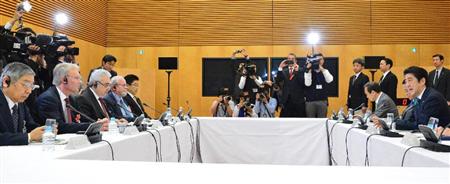 国際金融経済分析会合(第6回)に臨む安倍晋三首相(右)=21日午前、首相官邸(斎藤良雄撮影)【拡大】