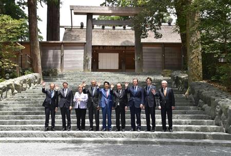 伊勢神宮の正宮前で記念撮影を行う安倍首相(右から5人目)らG7各国首脳=26日、三重県伊勢市【拡大】
