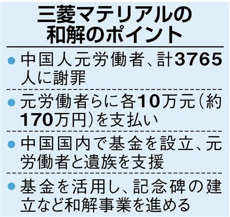 【北京=矢板明夫】第二次大戦中、日本で過酷な労働を強いられたとして中国の元労働者らが日本企業に賠償を求めている問題で、三菱マテリアル(旧三菱鉱業)は1日、謝罪の表明とともに1人あたり10万元(約170万円)を支払うことなどで、元労働者らと和解した。北京市内のホテルで調印式が行われ、両者が関連文書に署名した。日本企業が絡む他の戦後補償問題にも影響しそうだ。