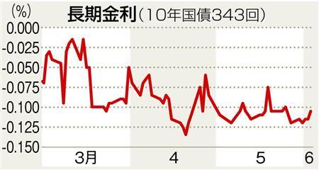 10日の国債市場は、長期金利の指標である新発10年債(343回債、表面利率0・1%)の利回りが一時、前日終値より0・025%低いマイナス0・155%となり、過去最低を更新した。