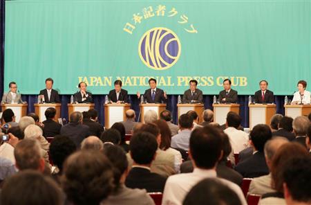 22日の参院選(7月10日投開票)公示を前に与野党9党首は21日午後、東京・内幸町の日本記者クラブで開かれた討論会で、「アベノミクス」の継続など経済政策を中心に論戦を繰り広げた。アベノミクスによる成長で社会保障の財源を確保すると主張する自民・公明両党に対し、民進党は社会保障を重視した経済政策への転換をアピール。景気対策や社会保障などをめぐって、各党の意見の違いが浮き彫りになった。