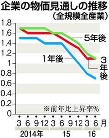 日銀が4日発表した6月時点の企業の物価見通しは、1年後の平均値が0.7%上昇と前回3月調査から0.1ポイント低下し、4四半期連続で過去最低の水準となった。年明けからの円高進行や個人消費の鈍さが原因で、日銀は今年度の生鮮食品を除く消費者物価指数の上昇率見通しを下方修正する検討に入る。
