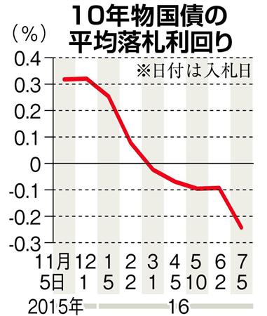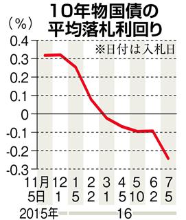 財務省が5日に実施した7月発行の10年物国債の入札で、平均落札利回りがマイナス0.243%となり、過去最低を更新した。日銀のマイナス金利政策に加え、英国の欧州連合(EU)離脱決定を受け、投資マネーが国債などの安全資産に流れていることが背景にある。