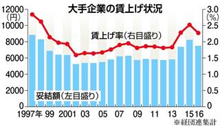 安倍晋三政権が企業に賃上げを要請する「官製春闘」によって、3年連続で率が2%、額も7000円を超えた。しかし、中国などの新興国経済の減速や円高の進行などで、景気の先行き不透明感が増したことに加え、労組側もベア要求額を減らしたため、賃上げ率は過去2年に比べ、鈍化した。