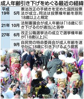 法相の諮問機関の法制審議会は成人年齢の引き下げをめぐり、21年に「18歳に引き下げるのが適当」と答申しており、与野党を通じて異論は少ない。政府は、民法改正案を来年3月に閣議決定して来年の通常国会に提出する方針で、同国会で成立する見通しだ。