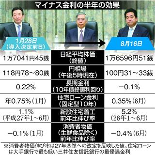 日銀が「マイナス金利政策」を導入してから16日で半年を迎えた。市場金利の大幅な低下で住宅ローンや投資が活発になる一方、金融機関は収益悪化にあえぐ。また、消費者物価はマイナス圏に沈み、最大の目的である2%物価目標の達成は見通せない。「マイナス金利の功罪は相半ば」(エコノミスト)しており、日銀は9月の金融政策決定会合でこれまでの金融政策を総括的に検証する。