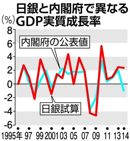 内閣府は国連が定めた基準に基づき、主に個人消費や設備投資などの統計項目を積み上げる形でGDPを算出している。14年度は増税前の駆け込み需要の反動が出て消費は低迷したが、「GDPの落ち込みが大きすぎるのではないか」(エコノミスト)との見方は多かった。