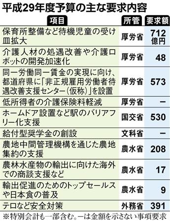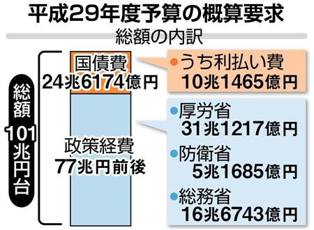 2017年度予算の概算要求は、高齢化に伴う医療費などの増加を背景に3年連続で100兆円の大台を超えた。財務省は年末にかけての予算編成で5兆円程度を削りたい考えで、歳出の3割を占める社会保障費の絞り込みがカギとなる。ただ、保育の充実などをめぐる与党などの歳出圧力は強い。消費税増税再延期などで歳入が制約される中、財政再建への姿勢をどこまで強く示せるかが焦点だ。