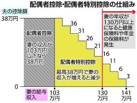 所得税の配偶者控除は妻の年収が103万円以下なら、夫の課税所得から38万円を差し引く仕組み。夫が会社員で十分な収入があり、妻が家事や育児で家庭を支えるモデルを前提に1961年に創設された。