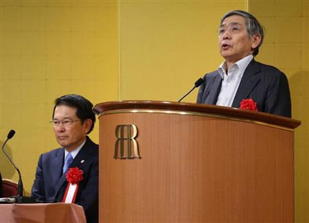 関西の各経済団体との懇談会で挨拶する日銀の黒田東彦総裁(左は大阪商工会議所の尾崎裕会頭)=26日午後、大阪市北区(恵守乾撮影)【拡大】