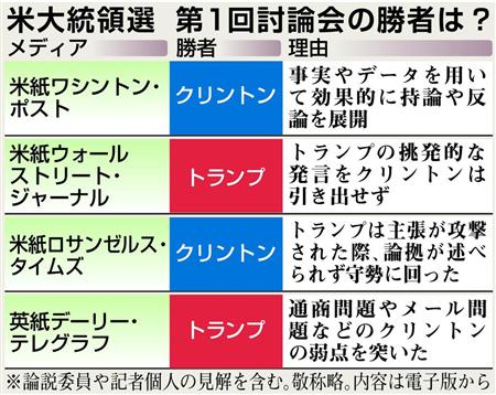 「世紀の討論」と称された米大統領選の民主党候補、クリントン氏と共和党候補、トランプ氏による初のテレビ討論会。国際規模の外交・安全保障問題や経済のほか、女性の大統領としての「資質」の問題にも議論が及んだ。