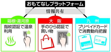 経済産業省は28日、外国人観光客が指紋などの生体認証だけで買い物や温泉の利用ができる「おもてなしプラットフォーム」の実証実験を10月から開始すると発表した。2020年東京五輪・パラリンピックを見据え、現金を持ち歩かなくてすむ環境を整えるのが目的。あらゆる機器をインターネットにつなげる「モノのインターネット(IoT)」で訪日客の利便性向上につなげる。