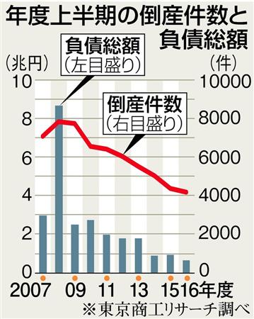 東京商工リサーチが11日発表した2016年度上期(4~9月)の企業倒産件数(負債総額1000万円以上)は、前年同期比3.9%減の4217件となり、8年連続で低下した。金融機関が中小企業への融資で返済猶予に応じていることや大企業の業績改善が続いており、景気全体を底上げしていることなどが要因。バブル期の1990年度上期の3070件以来、26年ぶりの低水準となった。