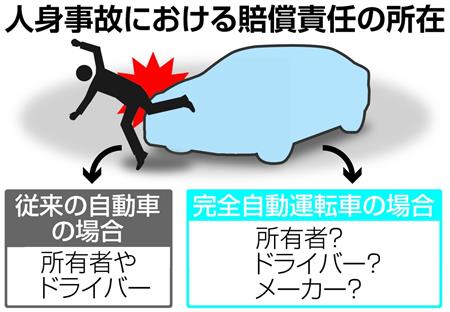 交通死亡事故の9割以上はドライバーの法令違反が原因で、自賠法で人身事故は原則、車の所有者やドライバーが賠償責任を負うと規定している。だが完全自動運転車ではドライバーが運転に関与せず、車に搭載された人工知能(AI)が通信機能との連携で周囲の状況を判断してハンドルやブレーキなどを操作するため、これまでの法規制が当てはまらないケースが想定される。