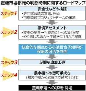 それによると、現在行われている都の専門家会議や市場問題プロジェクトチームで安全性の検証を終えた後、都の審議会に変更を届ける環境アセスメントを実施する。アセスメントが工事の一部変更のみで済む場合は1~2カ月の期間で審査が終了するが、大幅な環境対策が必要とされた場合の審査には、約15カ月かかるとした。