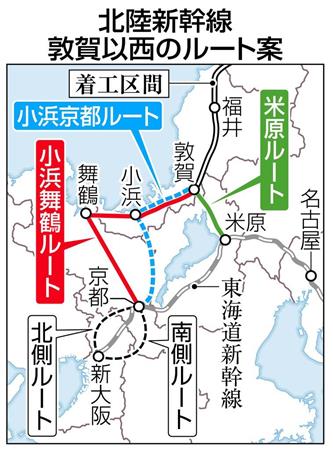 建設費は安い順に米原(50キロ)が5900億円、小浜京都(140キロ)が2兆700億円、小浜舞鶴(190キロ)が2兆5千億円。工期は距離が最も短い米原が10年で、残りの2案は15年だった。