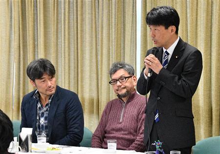 クールジャパン戦略推進特命委員会に臨む(左から)川口典孝氏、庵野秀明監督、自民党の山本一太氏=16日午後、東京・永田町の自民党本部(斎藤良雄撮影)【拡大】