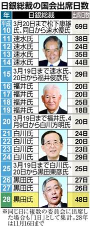 日銀の黒田東彦総裁の国会出席日数が今年に入り、増え続けている。16日時点で48日を数え、50日の大台突破が見えてきた。マイナス金利や長期金利の誘導目標といった目新しい政策を導入した一方、任期中の物価上昇目標2%の達成をほぼ諦めたことで、「アベノミクス失敗」を既成事実化したい野党の格好の攻撃材料となっている。