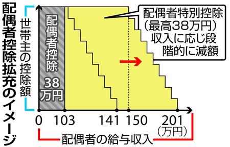 具体的には、妻の年収が150万円以下までは38万円の控除を受けられるようにし、150万円超から201万円未満の世帯は、控除を段階的に縮小する仕組みに切り替えるとみられる。