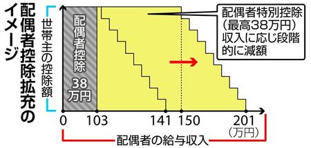 政府・与党が配偶者控除の見直しで、妻の年収要件を「150万円以下」に引き上げても「201万円」までは控除を受けられる仕組みの導入を検討していることが24日、分かった。控除額が徐々に減っていくようにすることで、世帯の手取りが急減しないように配慮する。