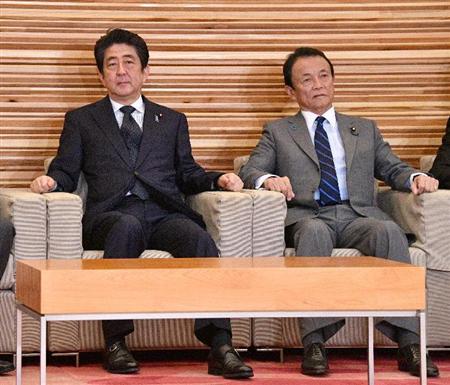 閣議で安倍晋三首相(左)と麻生太郎副総理兼財務相=13日午前、首相官邸(斎藤良雄撮影)【拡大】