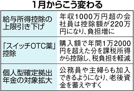 来年1月1日から税や年金など暮らしに身近な制度が変わる。「給与所得控除」の見直しでは高所得のサラリーマンが増税になる一方、「スイッチOTC薬」と呼ばれる市販薬を購入した際に税負担を軽減する仕組みが導入される。個人で年金資産を運用する個人型確定拠出年金は主婦や公務員らも対象になり、運用益が非課税になるなどのメリットがある。