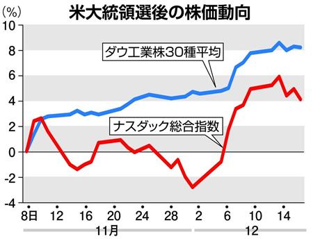 特に、情報技術(IT)など新興企業で構成されるナスダック総合指数との差が大きい。16日終値でダウ平均が大統領選投票日だった11月8日比で約8%上げているのに対して、ナスダック指数は約4%高にとどまる=グラフ。