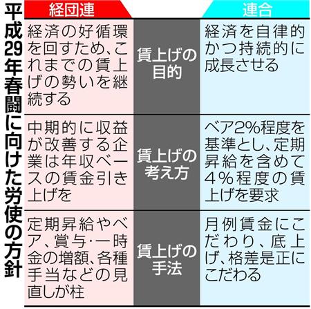 2017年春闘に向けた労使それぞれの方針がほぼ固まった。安倍晋三首相の賃上げ要請もあり、労使とも賃上げの必要性では一致する。ただ、従業員の基本給を一律に引き上げるベースアップ(ベア)へのこだわりを強調する連合に対し、経団連は年収ベースの賃金引き上げという昨年同様の基本姿勢は変えてない。今年も政府の意向に配慮する「官製春闘」の色合いが強いが、賃上げの手法をめぐり労使交渉は難航も見込まれる。