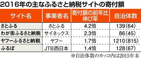 ソフトバンクのグループ会社、さとふるが運営するふるさと納税サイトのさとふるは、納税額、件数ともに前年比で4.2倍まで増えた。同社の高松俊和取締役は「テレビのCMを夏以降放映したことや取り扱い自治体数を約2倍に増やしたことが奏功した」と話している。また、全国の1156自治体の寄付を取り扱っているトラストバンクが運営するふるさとチョイスも、ほぼ倍増したとみられるなど、大手サイトの納税額は増加の一途だ。