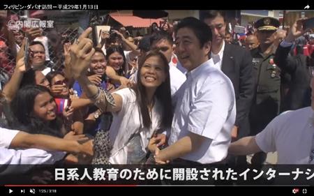 動画の長さは約3分。首相が住民や子供たちから熱狂的な歓迎を受けたり、ドゥテルテ氏と果物を試食したりする様子や、日本語を学ぶフィリピン人学生との対話などが映っている。