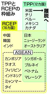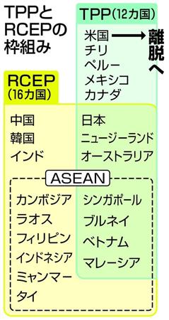 一方、中国外務省の華春瑩報道官は同日、米国のTPP離脱を受けて米国が参加していない東アジア地域包括的経済連携(RCEP)や、アジア太平洋自由貿易圏(FTAAP)を推進すると強調した。アジア太平洋経済協力会議(APEC)メンバーの参加を想定したFTAAPの実現に向けて、TPPに代わりRCEPをその土台にする意欲を示した形だ。