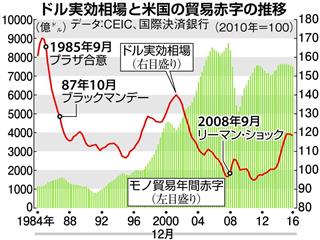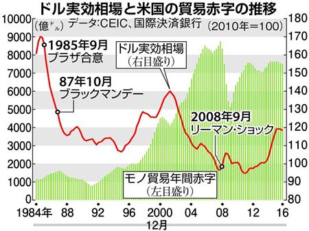 グラフは1985年9月のプラザ合意以来の主要国通貨に対するドルの実効相場と貿易赤字の推移である。87年10月の史上最大規模のニューヨーク株価大暴落(ブラックマンデー)、2008年9月のリーマン・ショック。いずれもドル安の最中だ。債務国米国は海外からの資金流入に依存している。ドル安におびえる投資家は何かのきっかけで、一斉に米金融市場から逃げ出す。