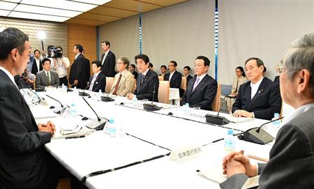 経済財政諮問会議に臨む安倍晋三首相(奥中央)ら=2日午後、首相官邸(斎藤良雄撮影)【拡大】
